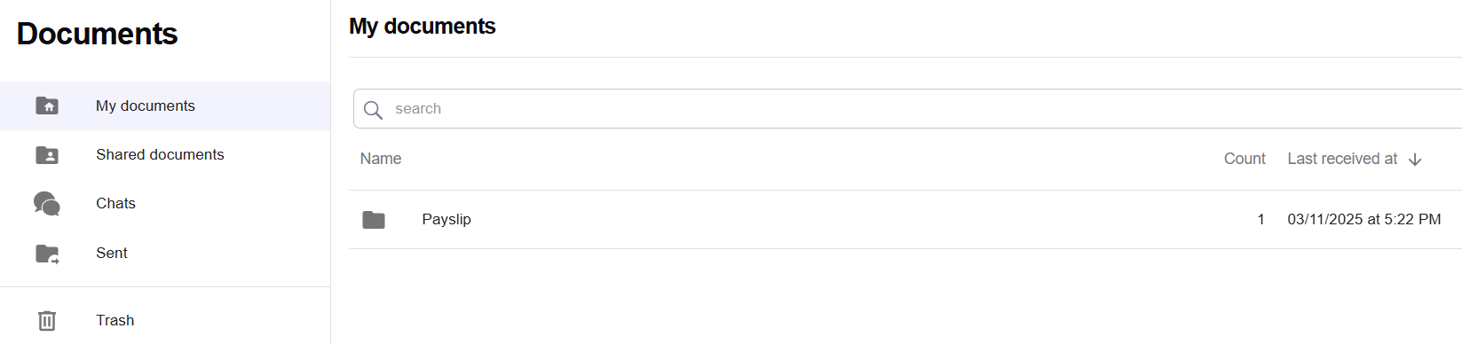 - My Documents: In My Documents, there are as many folders with personal files as there are Docubot/Templates submissions in the company. So, if there are “Payslips” and “Withholding Certificates,” for example, the user will see two folders with those names, containing the files you have sent them.