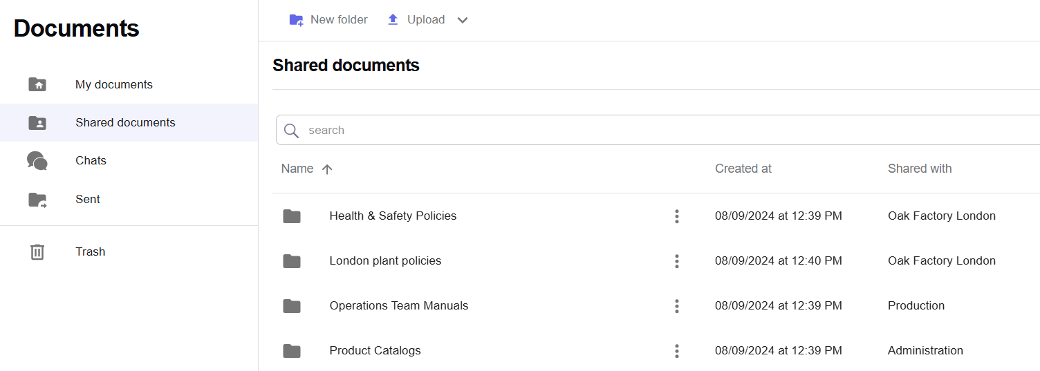 - Shared Documents: Do you need to collaborate on a project and share files with your colleagues? Or do you need a manual to always be available for your team to consult? In this folder, you will find the documents you have shared with any team. You will also be able to see the date they were created and with whom they were shared. In this folder, you can upload folders that won’t get lost and set permissions so that only the teams you choose can view them.